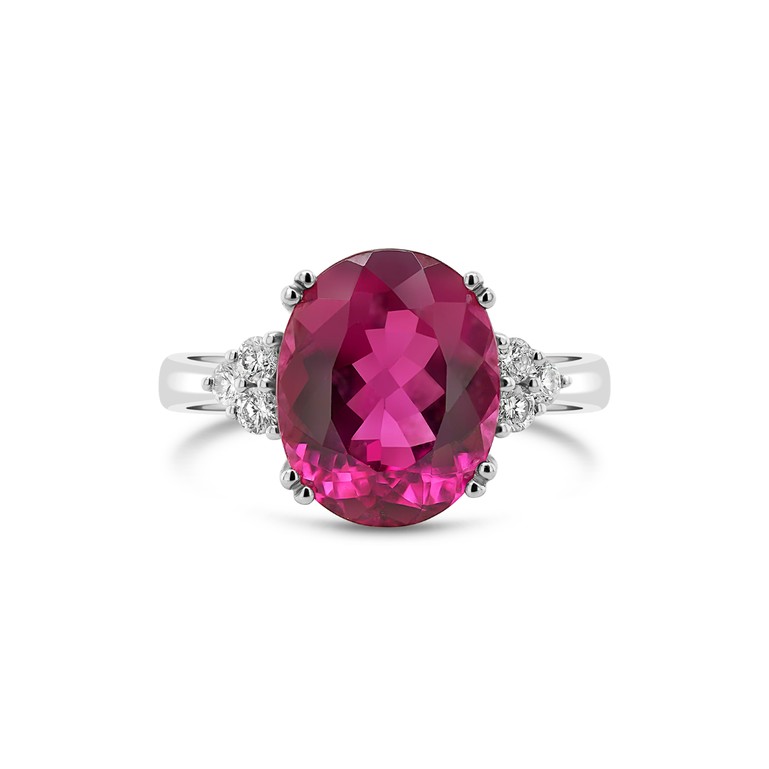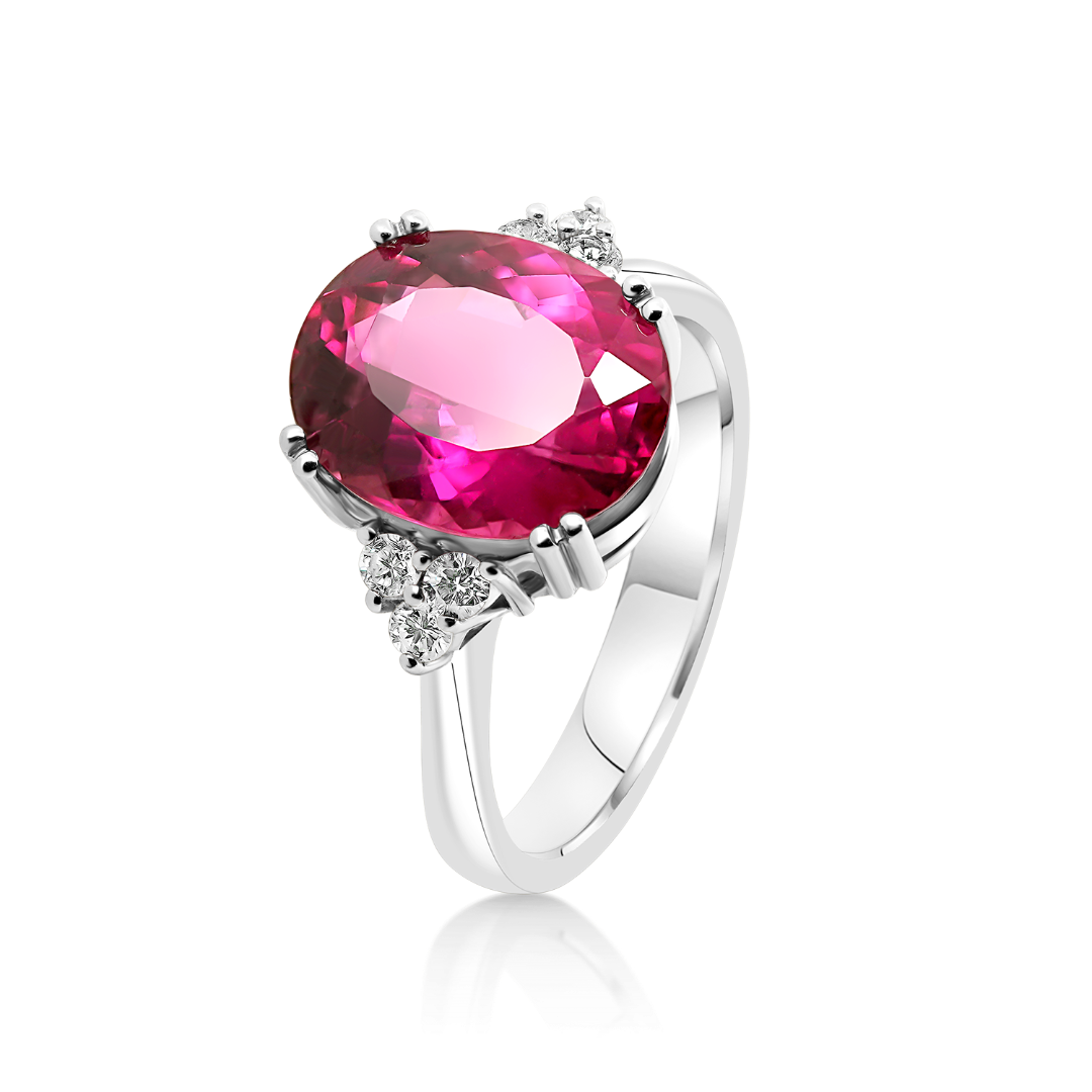 Inel din aur alb de 18K, încrustat central cu o Turmalină de 4.70ct și lateral cu 6 Diamante round brilliant de 0.22ct.