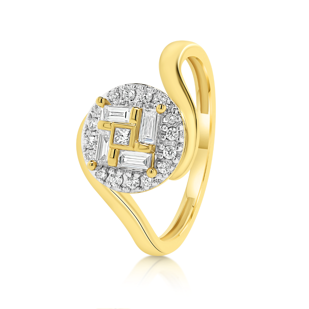 Inel din aur galben de 18K cu un Diamant Princess de 0.02ct., 4 Diamante Baguette cut de 0.150ct. și 16 Diamante Round Brilliant de 0.100ct.