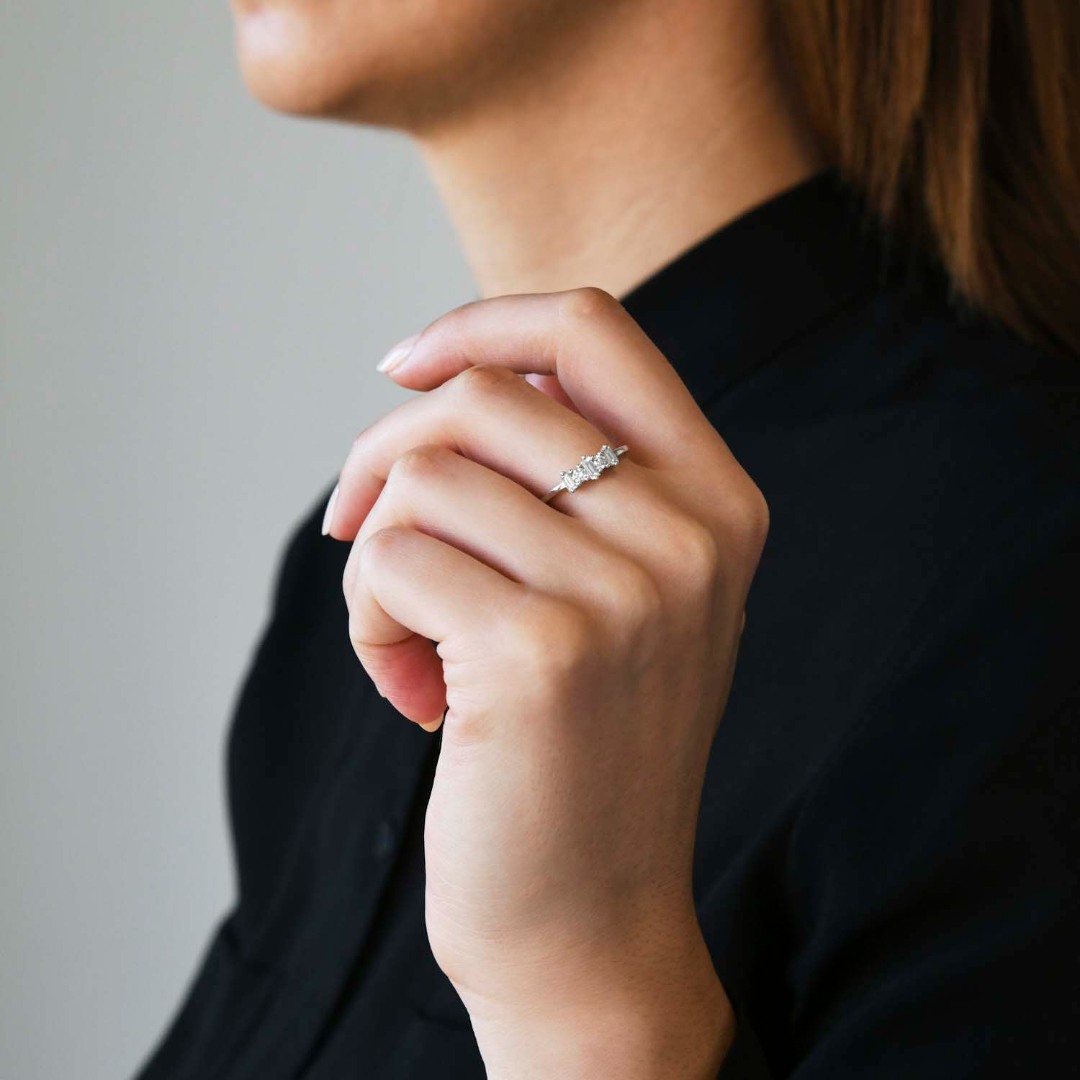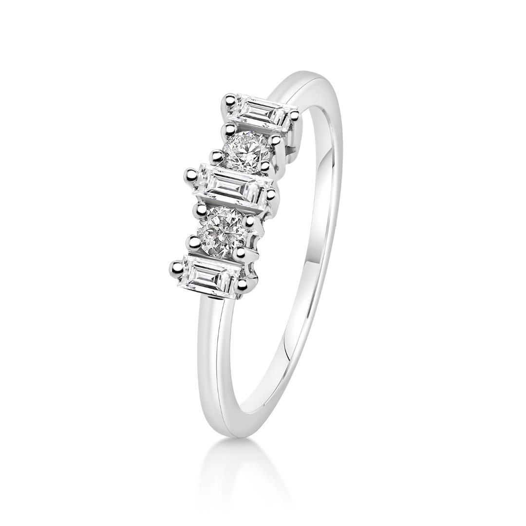 Inel din aur alb de 18K, încrustat cu 3 Diamante Baguette de 0.22ct. și două Diamante Round Brilliant de 0.16ct.