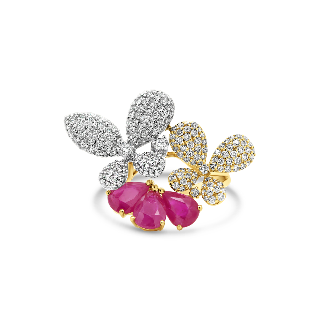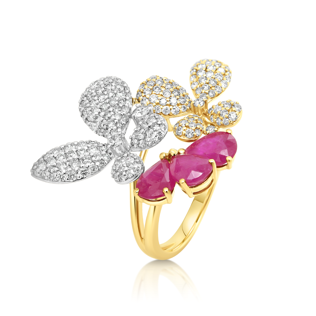 Inel din aur galben de 18K cu 3 Rubine de 2.497ct și  199 Diamante naturale Round Brilliant de 1.251ct.