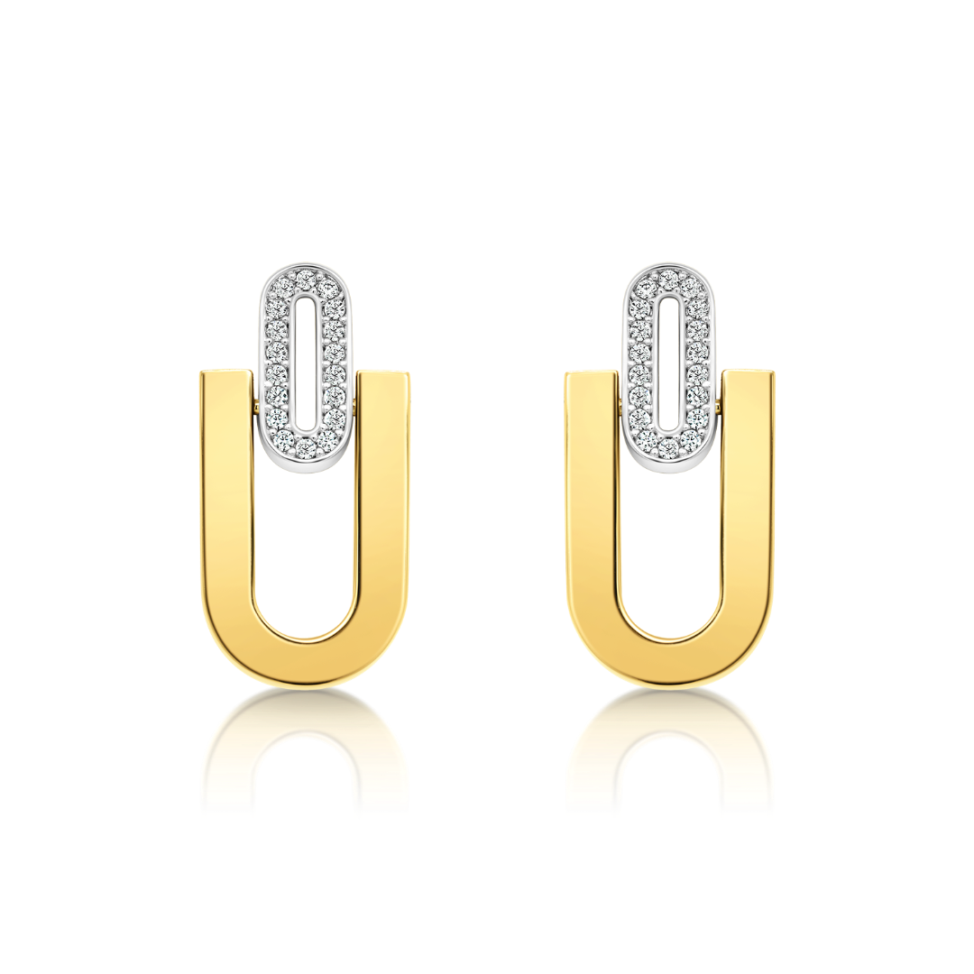 Cercei din aur alb de 14K cu elemente din aur galben și pietre cubic zirconia.