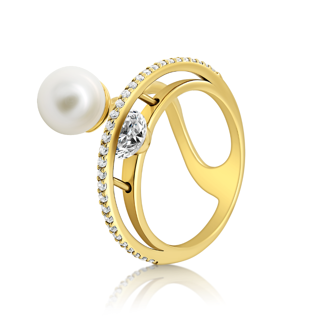 Inel din aur galben de 14K, cu perlă și pietre Cubic Zirconia albe.