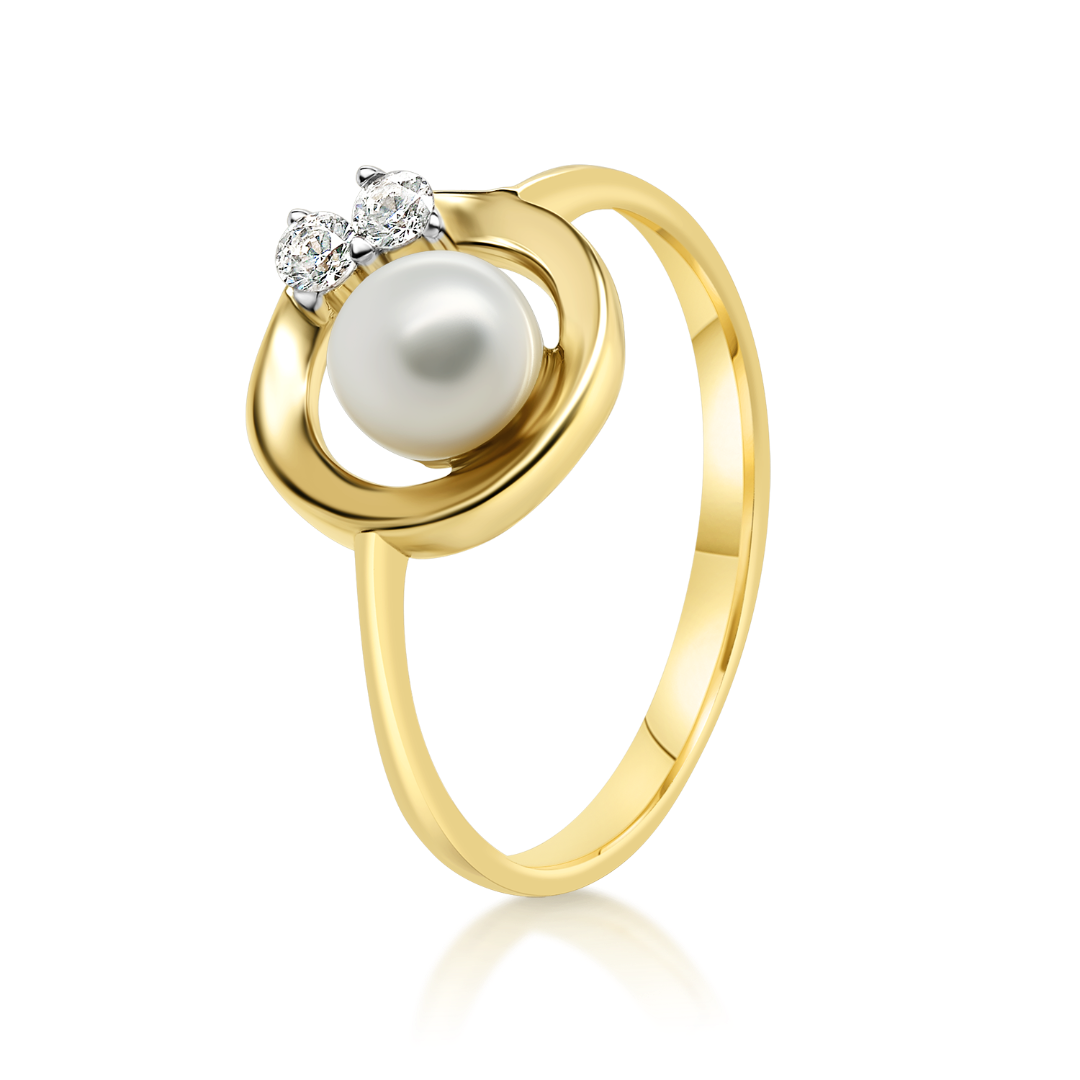 Inel din aur galben de 14K, cu Perlă albă de cultură și pietre Cubic Zirconia.