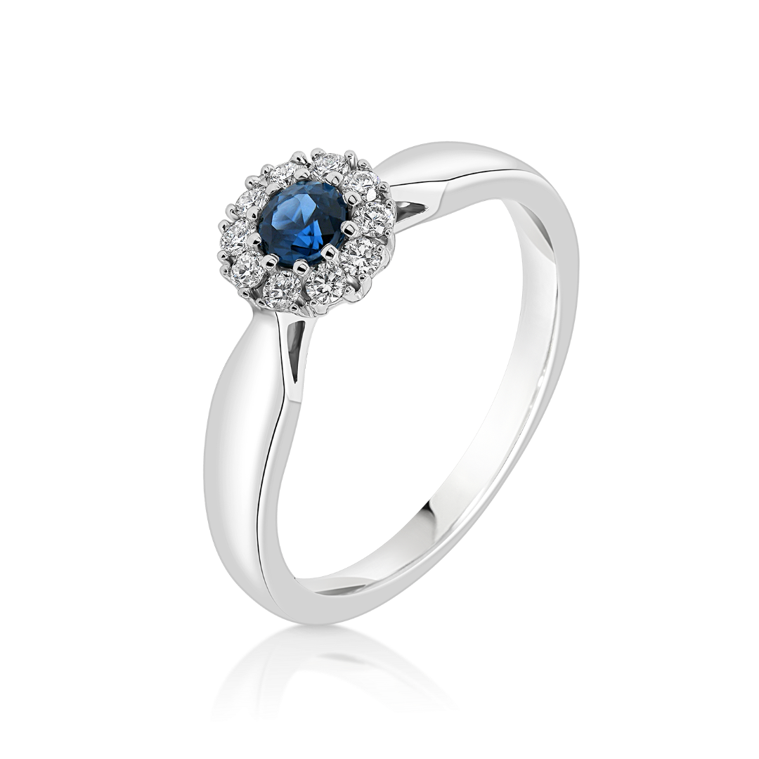 Inel din aur alb de 18K, încrustat cu Diamante Round 0.11ct. și un Safir albastru de 0.20ct.