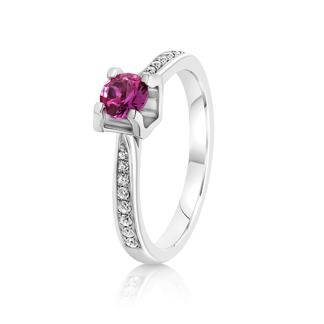 Inel din aur alb de 18K, cu piatră centrală Rubin de 0.40ct. și 16 Diamante naturale de 0.13ct.