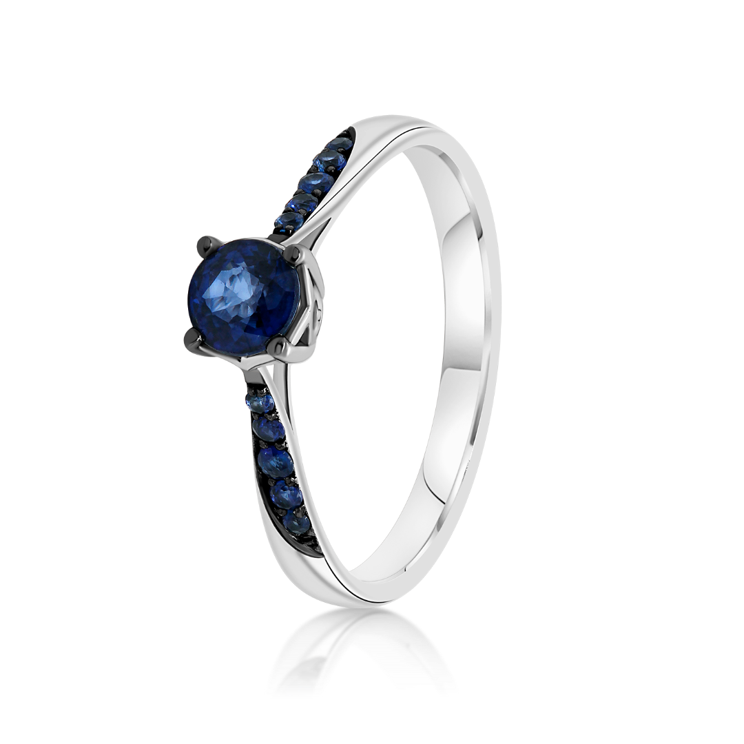 Inelul de logodnă din aur alb de 18K, încrustat cu Safire albastre cu o greutate totală de 0.56ct. și elemente cu Rodiu negru.