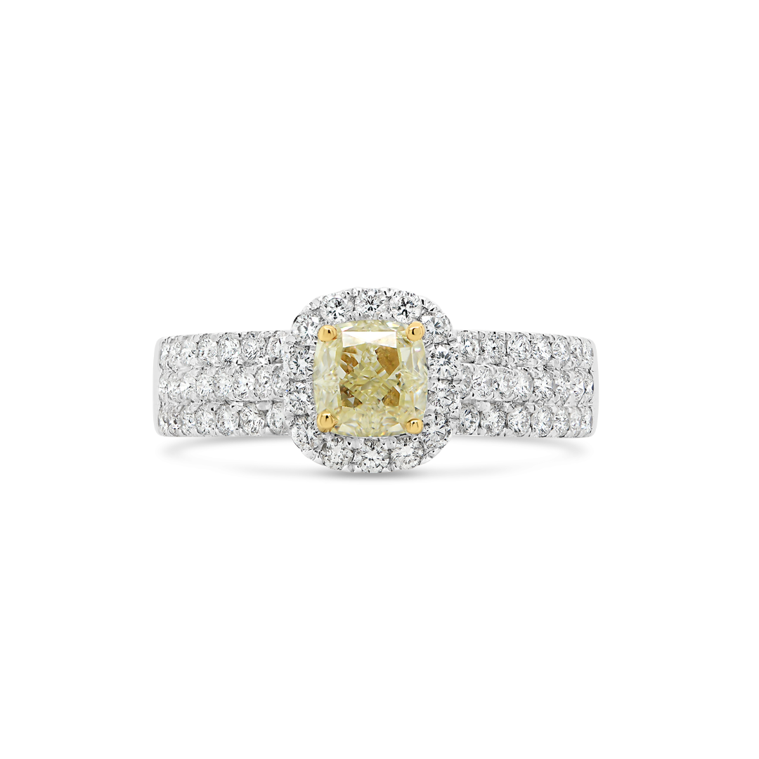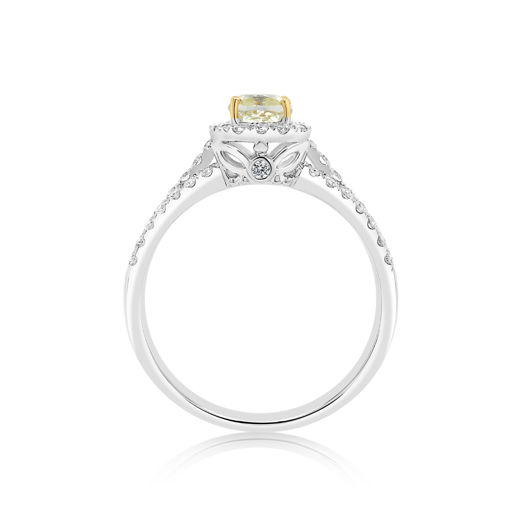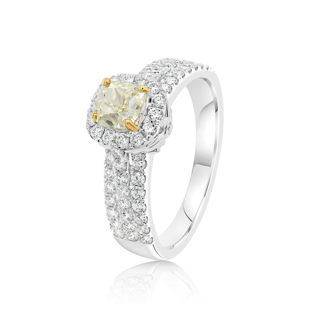 Inel din aur alb de 18K, cu un Diamant Fancy galben de 0.62ct și 60 de Diamante incolore Round Brilliant de 0.49ct.