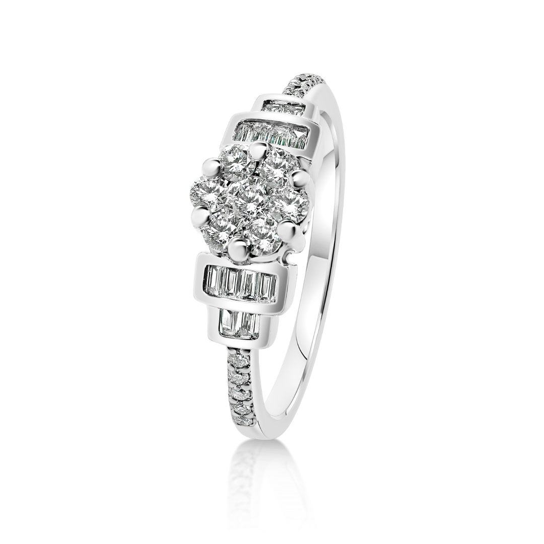 Inel din aur alb de 18K, încrustat cu Diamante Round Brilliant de 0.29ct și Diamante Baguette de 0.09ct.