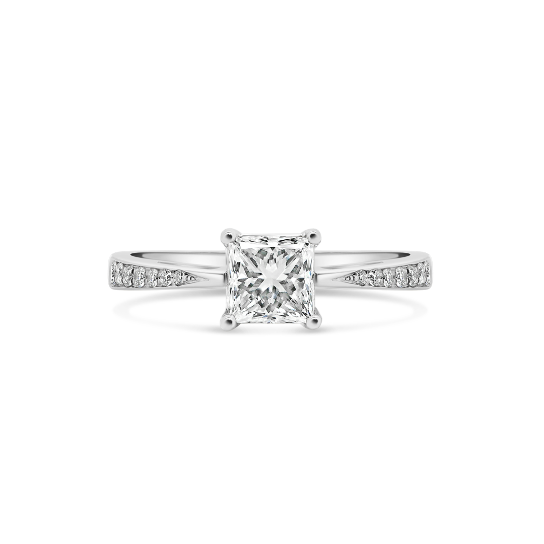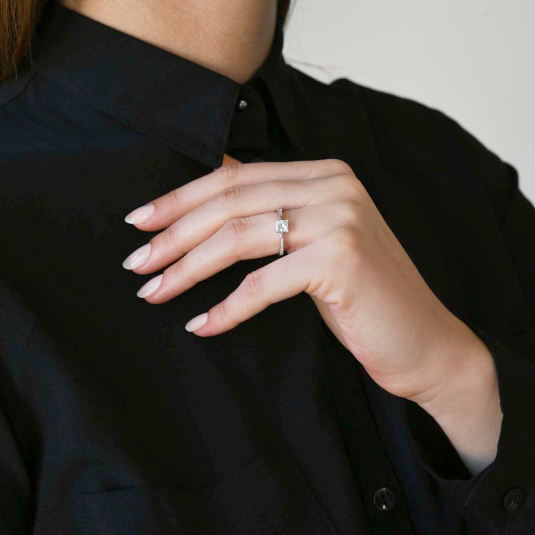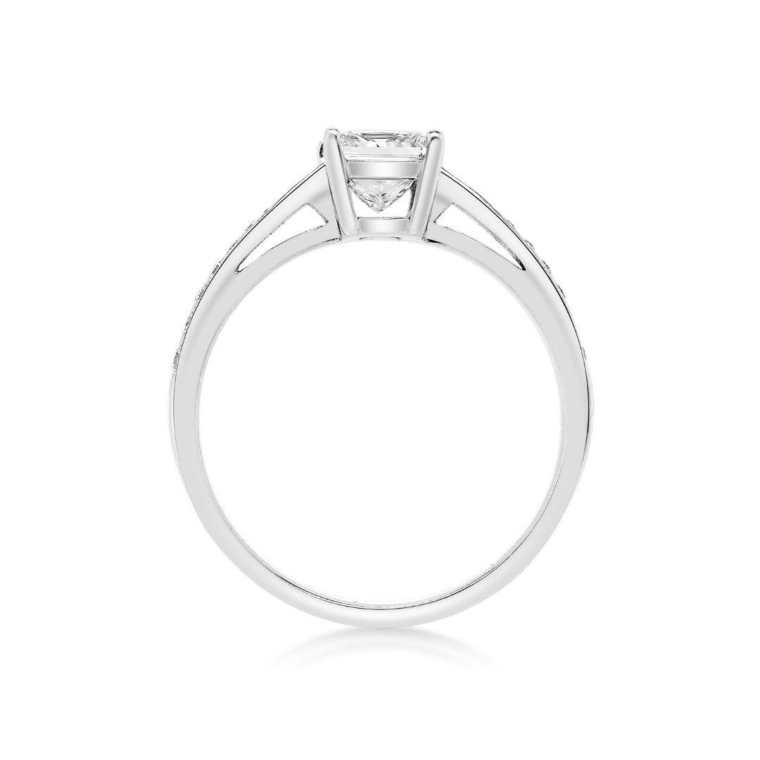 Inel de logodnă din aur alb de 18K, încrustat cu un Diamant Princess de 0.60ct certificat la Institulul Gemologic GIA cu numărul 7413378854 și 14 Diamante laterale Round Brilliant cu o greutate totală de 0.10ct.