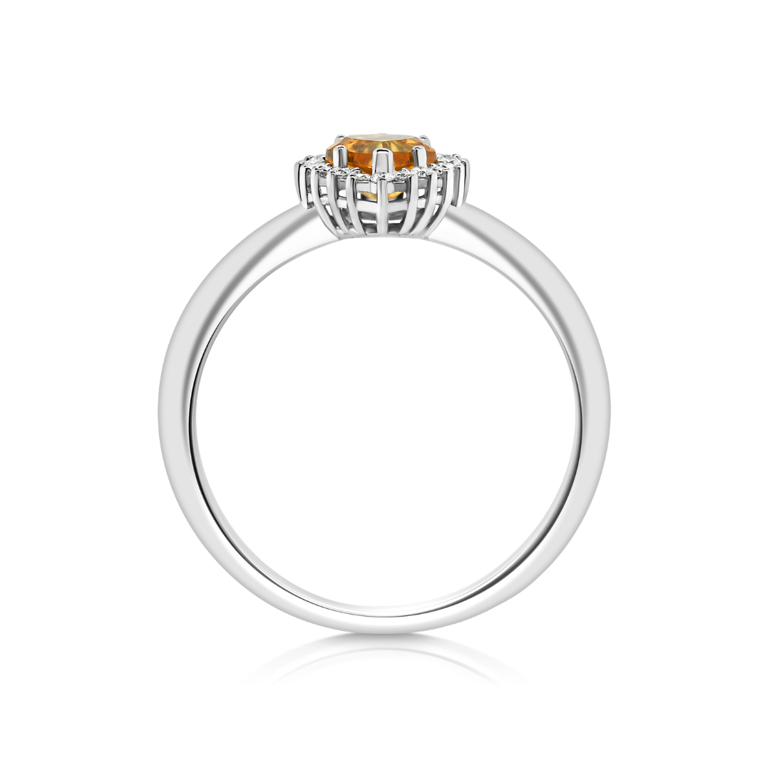 Inel din aur alb de 18K, încrustat cu 18 Diamante de 0.09ct. și o piatră Citrin de 0.38ct. în formă de inimă.