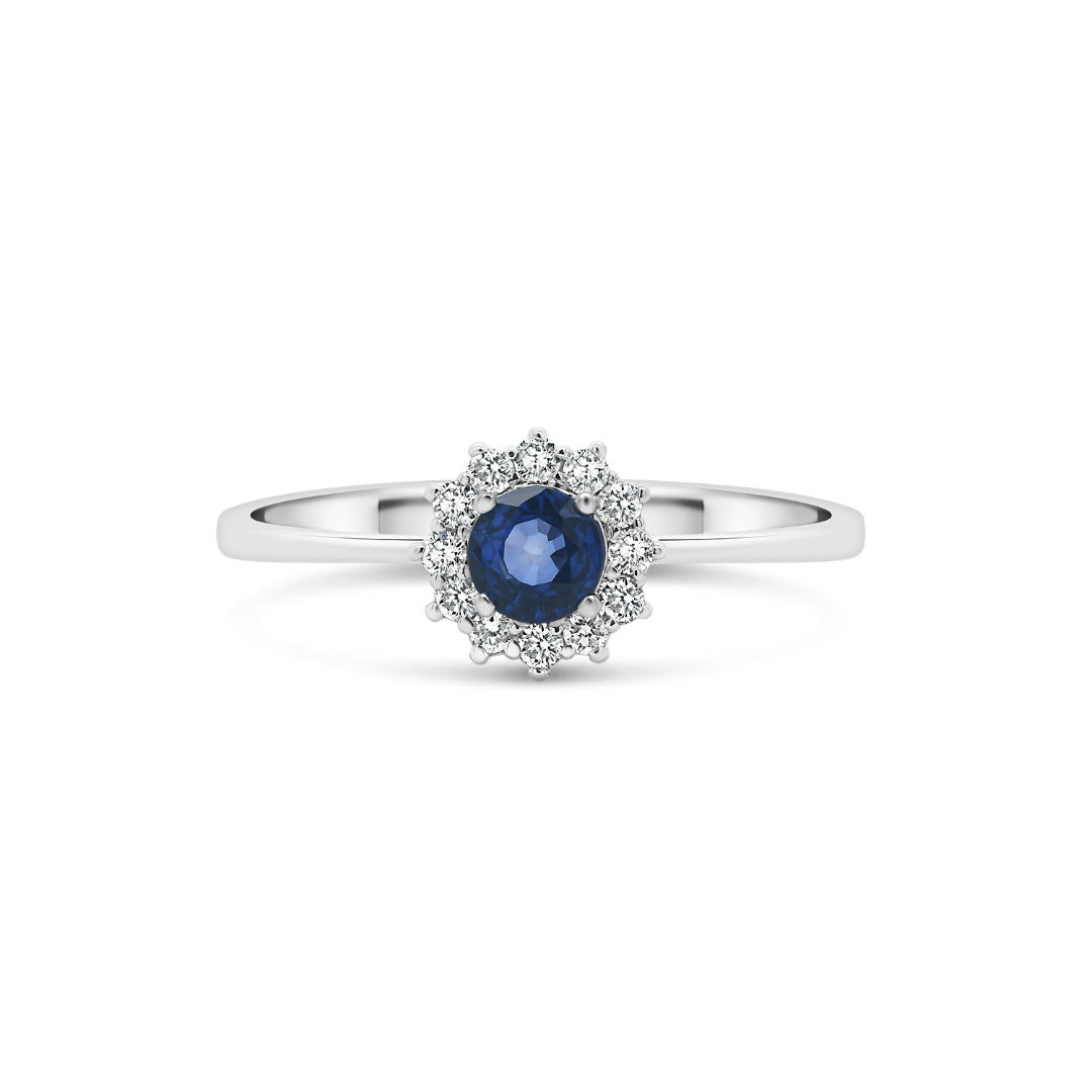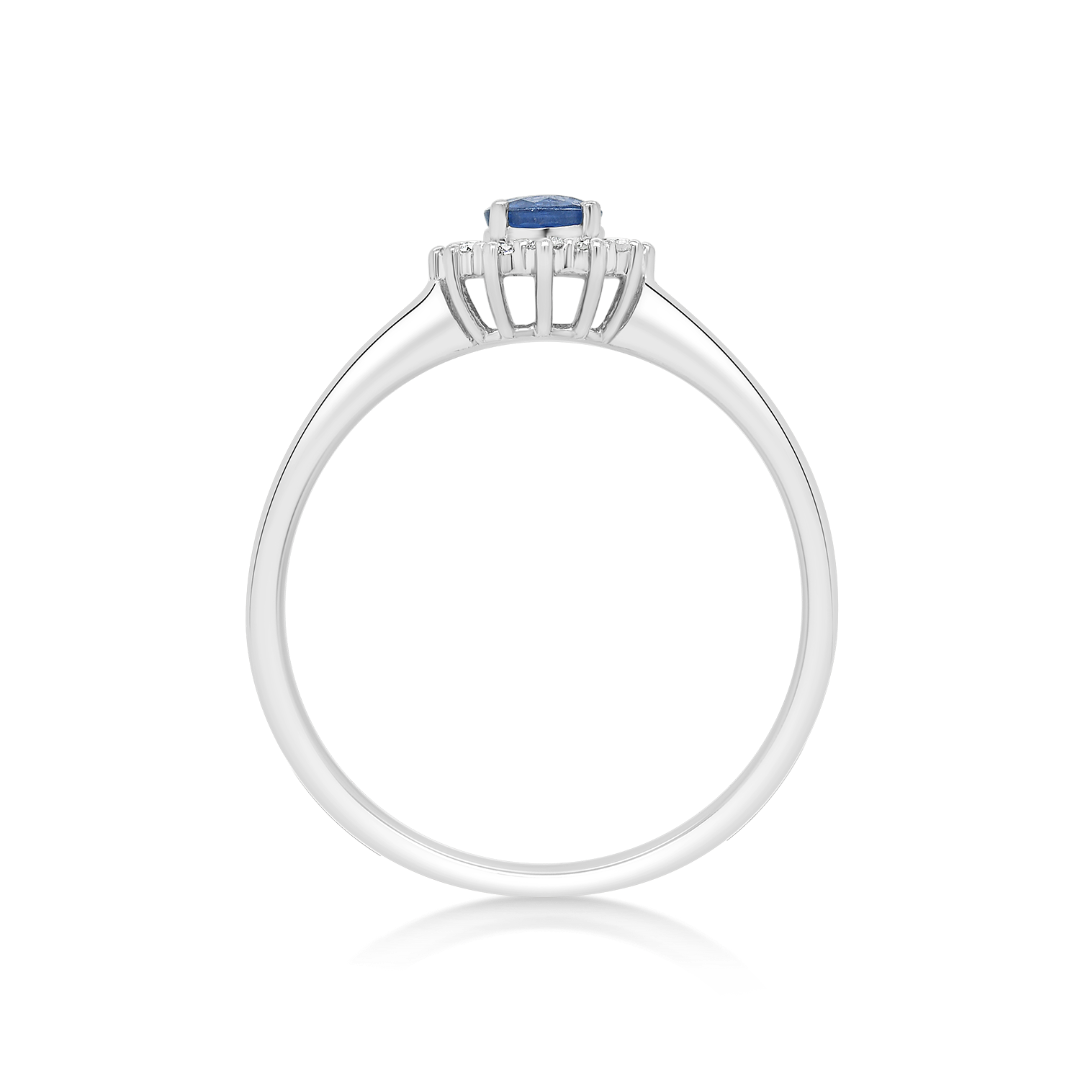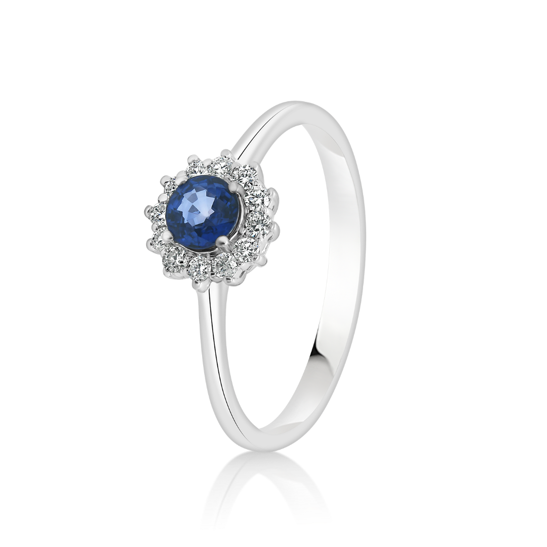 Inel din aur alb de 18K, încrustat cu 12 Diamante Round Brilliant de 0.13ct. și un Safir Albastru de 0.33ct.